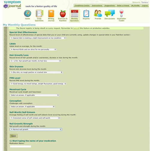 In your Monthly Questions area you will be able to input your current medications, supplements, treatments or special diets and track their effectiveness through the questions you answer either monthly or daily. By tracking your medication, supplement or treatments use you are better able to understand in a timely manner how well your different treatments are working towards creating better health. These discoveries are made quicker enabling you to save money, time, health treatment co-pays, doctor visits and saving you the frustration of symptoms not adequately treated.